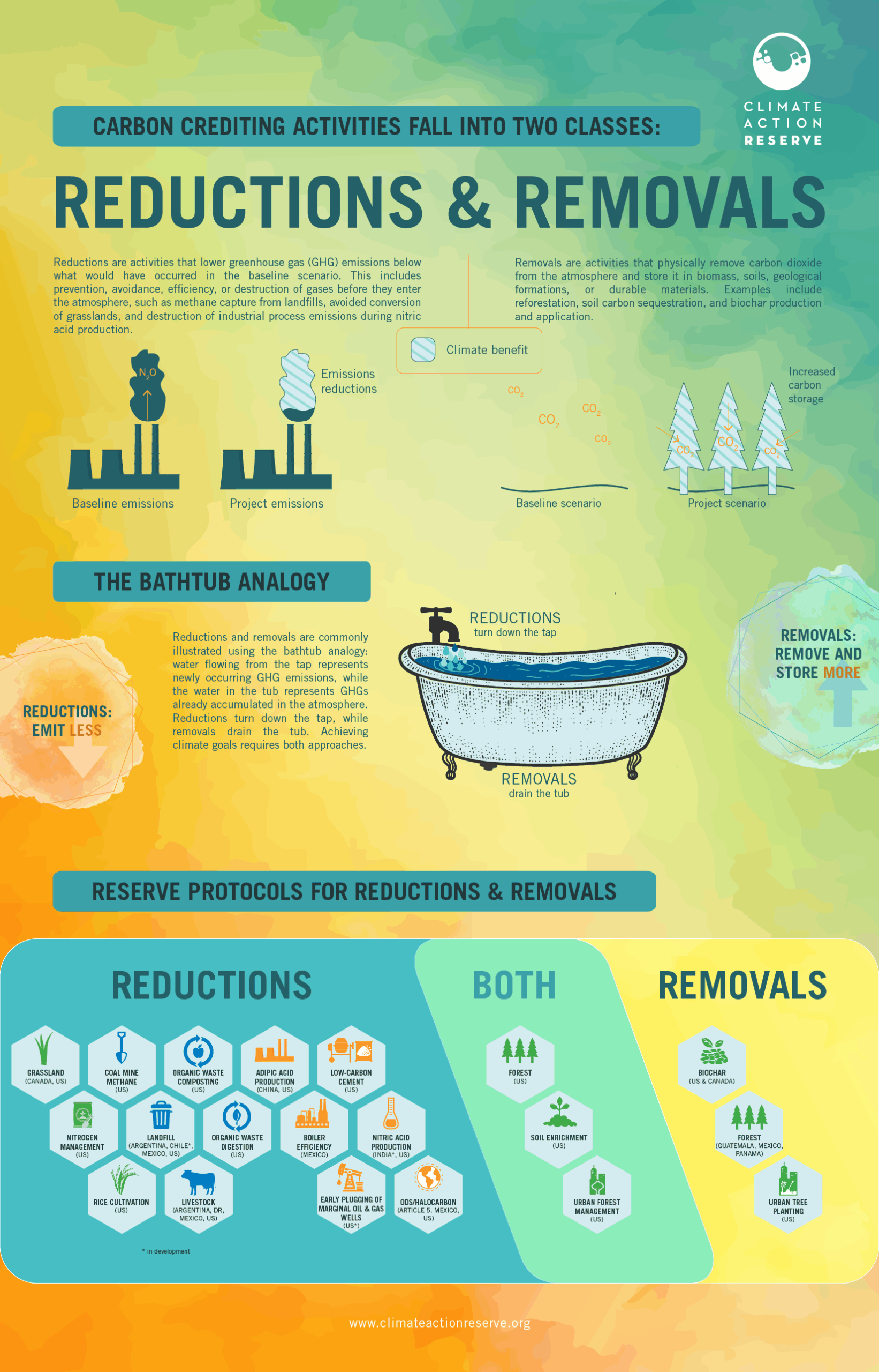 Carbon crediting activities fall into two core types: reductions and removals. Reductions are activities that lower emissions compared to business as usual through prevention, avoidance, efficiency, or destruction of GHGs before they enter the atmosphere. Removals are activities that physically remove CO₂ from the atmosphere and store it. Check out our latest infographic exploring the reductions and removals.